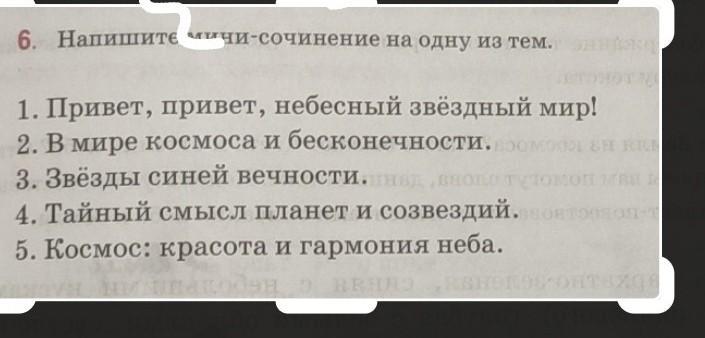 6. Напишите мини-сочинение на одну из теми 1. Привет, привет, небесный звёздный мир! 2. В мире космоса и бесконечности.OUL EN RILE 3. Звёзды синей вечности. но тутомон ва 4. Тайный смысл планет и созвездий. повтоодол т 5. Космос: красота и гармония неба.
