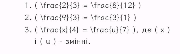 1) 2, поділене на 3, дорівнює 8, поділеному на 12; 2) відношення 9 до 3 дорівнює відношенню 3 до 1; 3) х відноситься до 4, як у відноситься до 7.