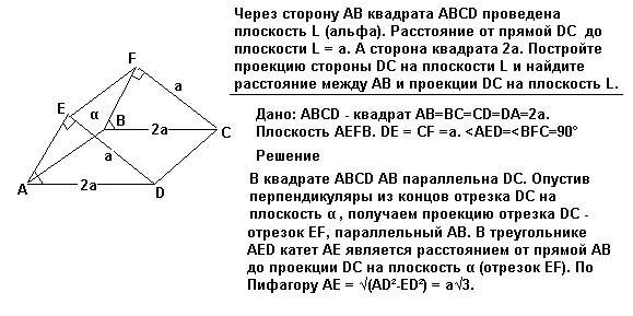 4. Через сторону AB квадрата ABCD проведена плоскость L (альфа). Расстояние от прямой DC до плоскости L = a. A сторона квадрата 2а. Постройте проекцию стороны DC на плоскости L и найдите расстояние между AB и проекции DC на плоскость L.