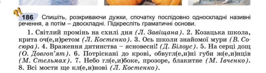Двоскладні речення: Світлий промінь (підмет)на схилі(присудок). Враження дитинства - ясновесні! На серці(присудок) дощ(підмет). Небо(підмет) глибоке (присудок), прозоре (присудок), блакитне (присудок). Всі мости (підмет) ще кленові(ще кленові).