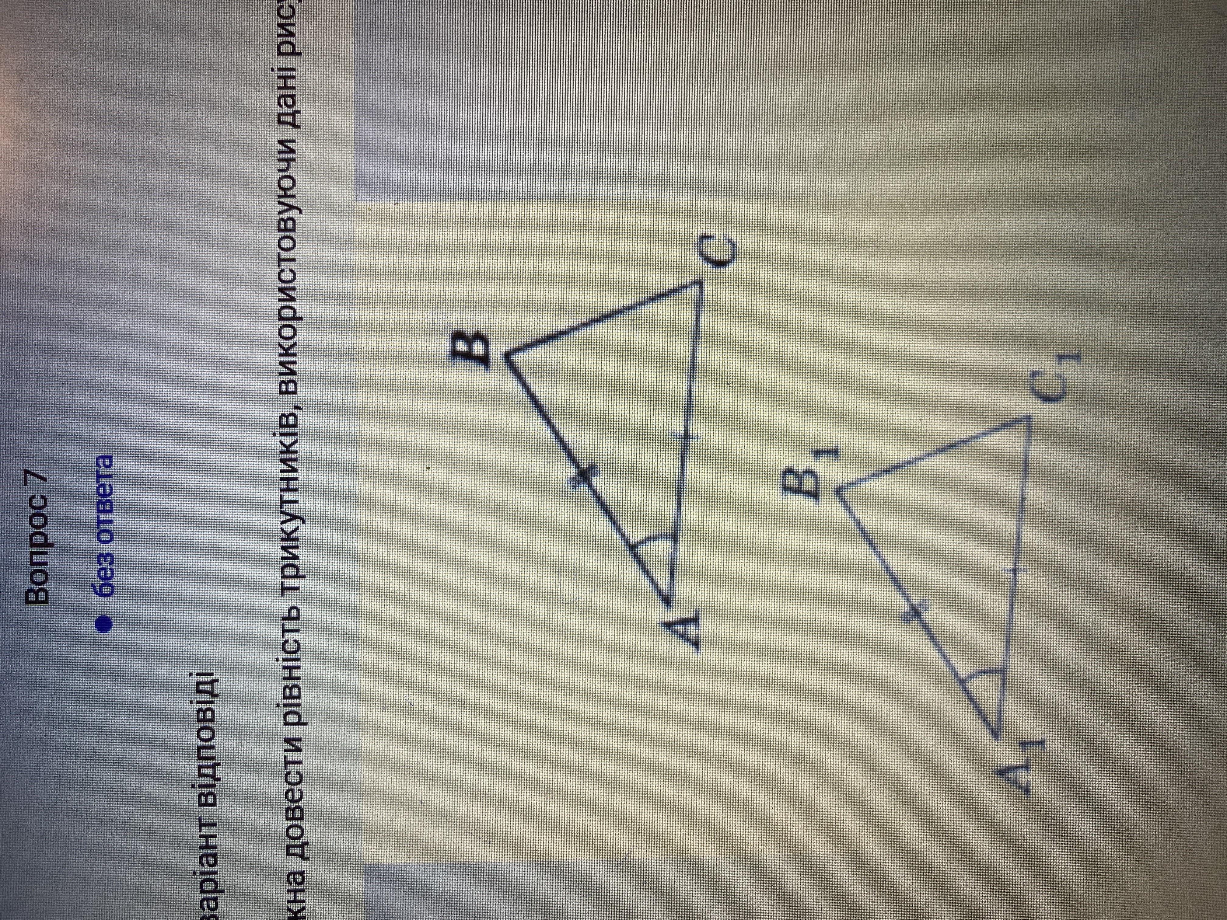 Трикутники будуть рівні за 1 ознакою рівності трикутників а саме за 2 сторонами і кутом між ними