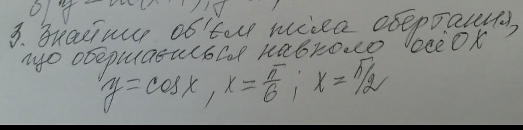 Отже, об'єм тіла обертання навколо вісі ОХ за функцією \( y = \cos x \), де \( x \) змінюється від \( \frac{\pi}{6} \) до \( \frac{\pi}{2} \), дорівнює \( \frac{\pi^2}{6} - \frac{\pi\sqrt{3}}{12} \) кубічним одиницям.