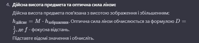 4. Висота предмета на фотознімку 7 см. Визначити дійсну висоту предмета, якщо відомо, що головна фокусна відстань обектива фотоапарата =50 см. Відстань від зображення до лінзи обектива =8м.Знайти оптичну силу лінзи.