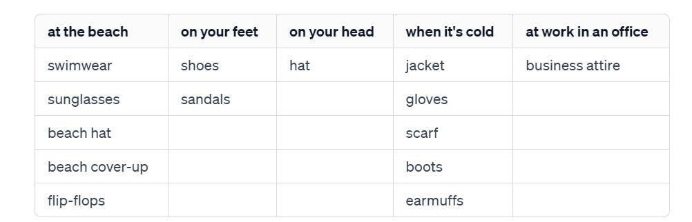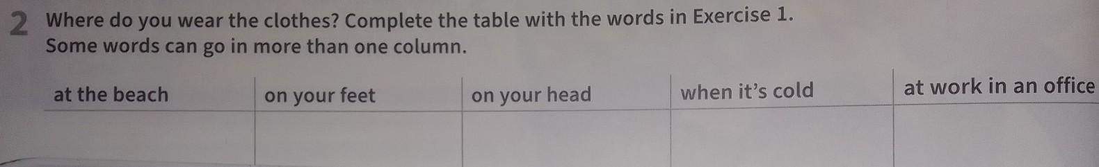 Please note that the items listed in the table are just examples, and the specific words may vary based on the context or preferences. If you have specific words from Exercise 1 that need to be included, please provide them, and I'll be happy to assist further.