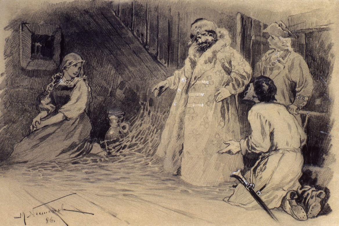 Це епізод приїзду Гриньова за Марією, де її мучив Швабрін, змушуючи вийти за нього заміж. Пугачов вчинив сумлінно і сказала якщо вбивати, то вбивати, милувати, так милувати. І дав свободу Гриньову та Марії, хоча вони не склали присяги Пугачову.