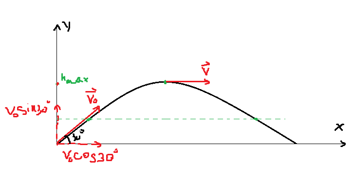 (на рисунке если спроектировать вектор скорости в наивысшей точке на ось y, он окажется точкой, т.е. его длина по оси y равна нулю, а значит и скорость по оси y равна нулю). Обратимся к уравнению выше и подставим туда то, что мы только что поняли.