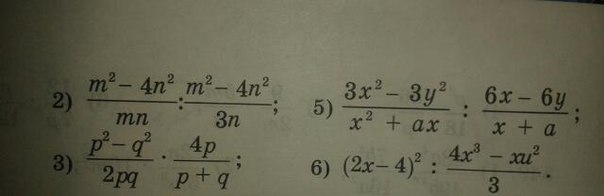 5) сначала при делении переворачиваем дробь. 3х2-3у2 (черта дроби) х2+ах множить всю эту дробь на х+а (черта дроби) 6х-6у = 3(х2-у2) (черта дроби) х (х+а) умножить на х+а (черта дроби) 6(х-у) = 3(х-у)(х+у) (черта дроби) х умножить на 1 (черта дроби) 6(х-у) = 3 (х+у) (черта дроби) 6х = х+у (черта дроби) 2х. Ответ: х+у (черта дроби) 2х