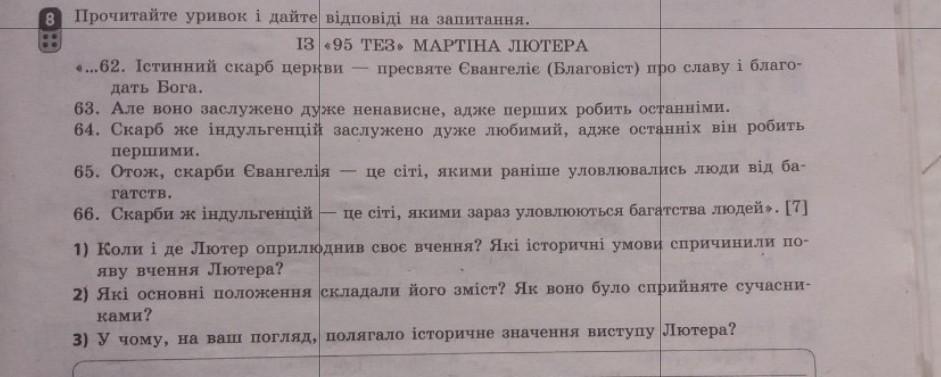 3) Історичне значення виступу Лютера полягає в тому, що він викликав розкол у Християнській церкві та спричинив появу нових конфесій. Реформація стала важливим етапом в історії християнства, приведучи до формування протестантських церков та значних змін у релігійній, соціальній і політичній структурах Європи.