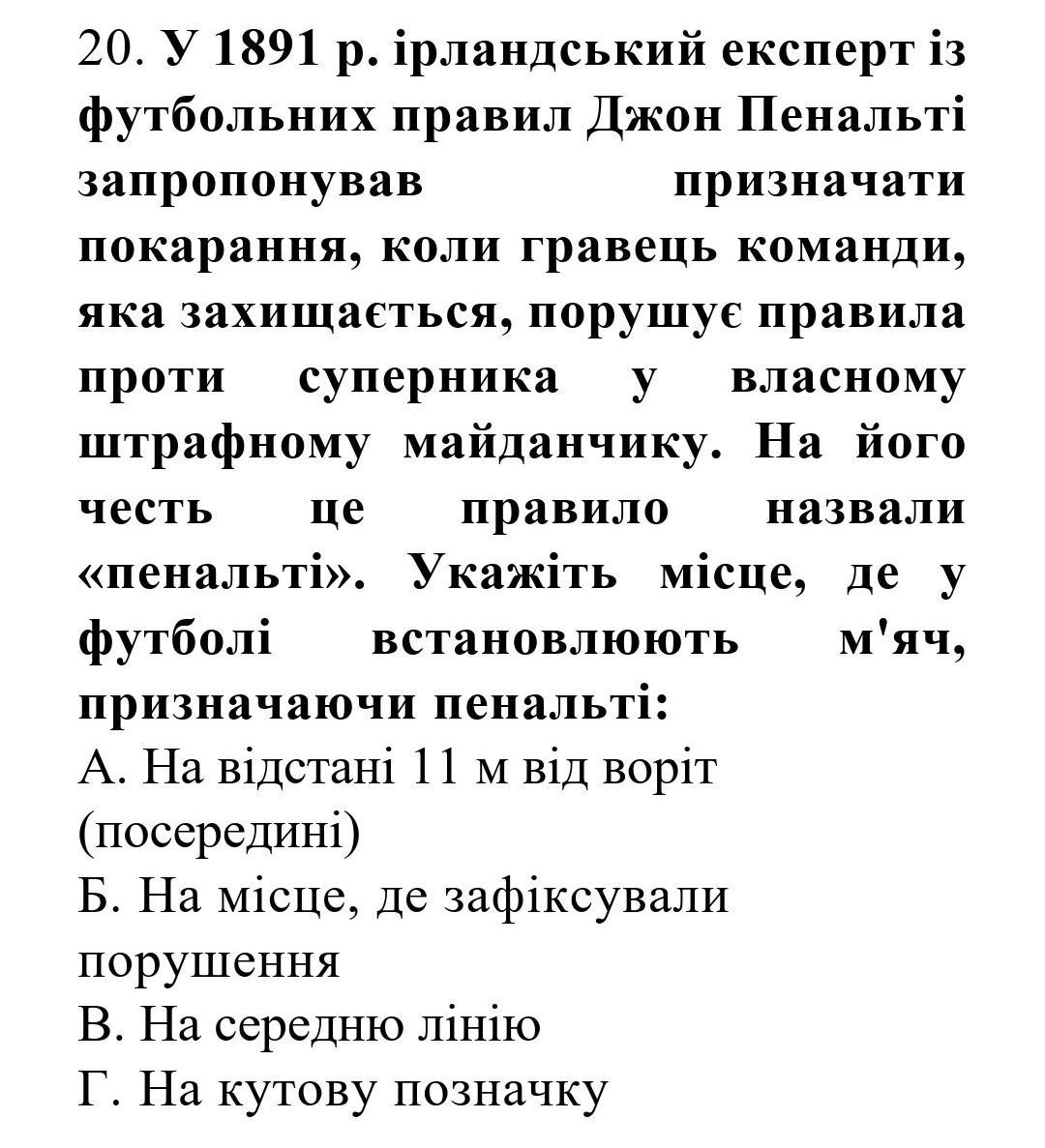 20. У 1891 р. ірландський експерт із футбольних правил Джон Пенальті запропонував призначати покарання, коли гравець команди, яка захищається, порушує правила проти суперника У власному штрафному майданчику. На його правило честь це «пенальті». футболі назвали Укажіть місце, де у встановлюють м'яч, призначаючи пенальті: А. На відстані 11 м від воріт (посередині) Б. На місце, де зафіксували порушення В. На середню лінію Г. На кутову позначку