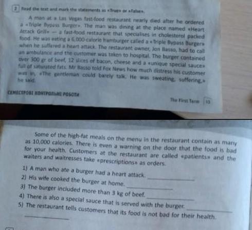 Read the test and mark the statements as tres or lates A man at a Las Vegas test food restaurant nearly died after he ordered Triple Bypass Burger The man was dining at the place named Heart Attack Grille fast-food restaurant that specialises in cholesterol packed food. He was eating a 6,000 calorie hamburger called a Triple Bypass Burgere when he suffered a heart attack. The restaurant owner, Jon Basto, had to call an ambulance and the customer was taken to hospital. The burger contained over 300 gr of beet, 12 slices of bacon, cheese and a sunique special sauce full of saturated fats. Mas told Fox News how much distress his customer wat The gentleman could barely talk. He was sweating, suffering he said СЕМЕСТРОВІ КОНТРОЛЬНІ РОБОТИ The Fist Term 15 Some of the high-fat meals on the menu in the restaurant contain as many as 10,000 calories. There is even a warning on the door that the food is bad for your health. Customers at the restaurant are called patients and the waiters and waitresses take prescriptions as orders. 1) A man who ate a burger had a heart attack. 2) His wife cooked the burger at home. ) The burger included more than 3 kg of beef. 3 4) There is also a special sauce that is served with the burger. 5) The restaurant tells customers that its food is not bad for their health.