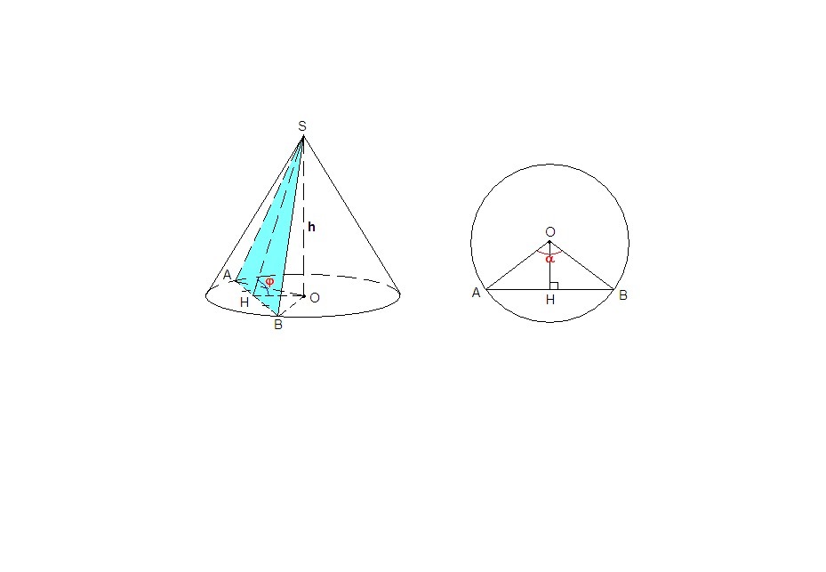 В конусе через его вершину под углом фи к плоскости основания проведена плоскость, отсекающая от окружности основания дугу альфа.Высота конуса равна h. найдите объем конуса. Желательно решите на листочке. Нужно сегодня!