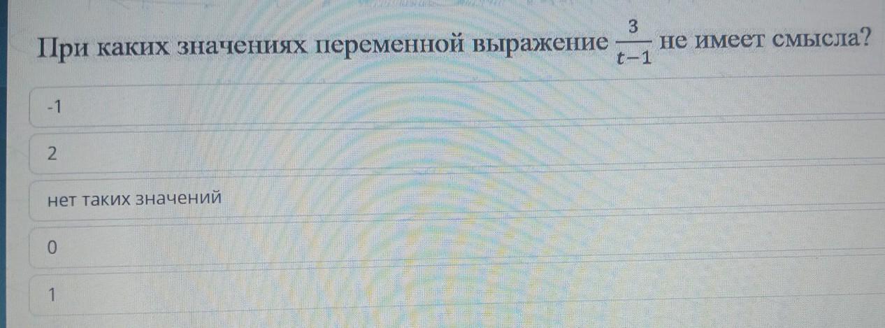 Для того чтобы выражение 3/t-1 не имело смысла, знаменатель не должен быть равен нулю. Таким образом, значение переменной t, при котором выражение не имеет смысла, будет равно 1. Поэтому правильный ответ - В) 1.