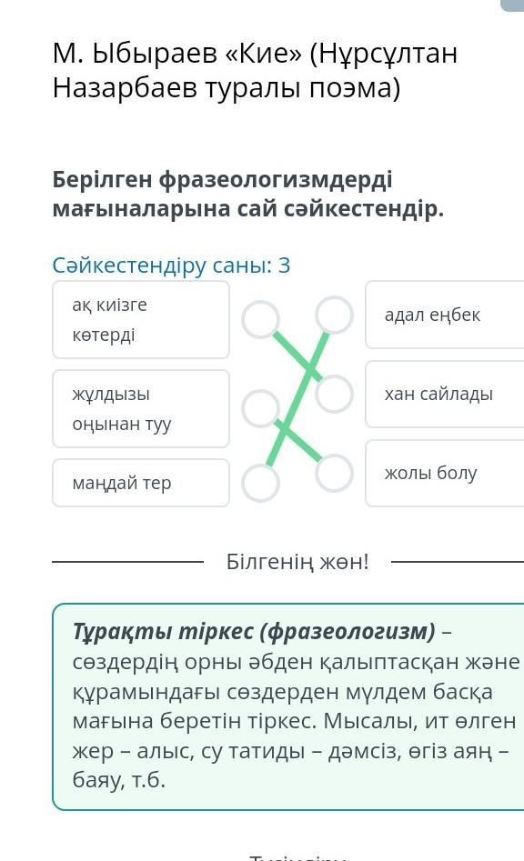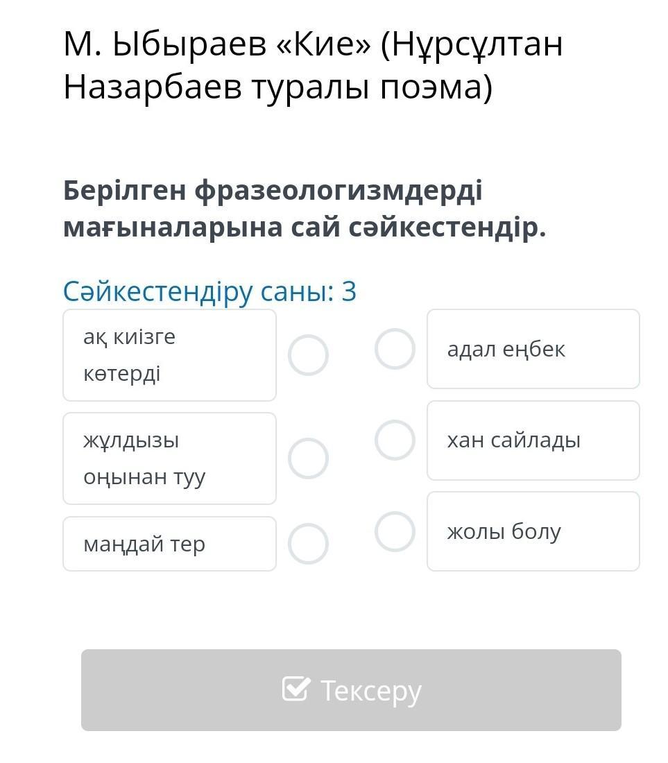 || М. Ыбыраев «Кие» (Нұрсұлтан Назарбаев туралы поэма) Берілген фразеологизмдерді мағыналарына сай сәйкестендір. Сәйкестендіру саны: 3 ақ киізге көтерді жұлдызы оңынан туу маңдай тер O Тексеру адал еңбек хан сайлады жолы болу