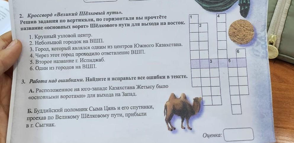 2. Кроссворд «Великий Шёлковый путь». Решив задания по вертикали, по горизонтали вы прочтёте название «основных ворот» Шёлкового пути для выхода на восток. 1. Крупный узловой центр. 2. Небольшой городок на ВШП. 3. Город, который являлся одним из центров Южного Казахстана. 4. Через этот город проходило ответвление ВШП. 5. Второе название г. Испиджаб. 6. Один из городов на ВШП. 1 2 3 сл 6