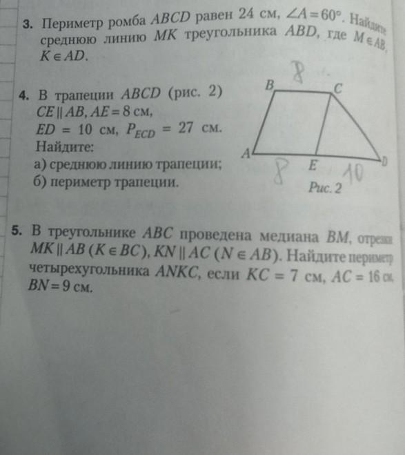 5. ВМ - медиана, значит АС=2*АМ = 2*16 = 32см. МК - средняя линия треугольника, так как она параллельна АВ и соединяет середину АС с серединой ВС и равна BN=AN. Точно так же NK - средняя линия этого треугольника и равна АМ. Тогда периметр четырехугольника ANKC равен Р=АС+AN+NK+KC = 32+19+16+23 = 90 см.