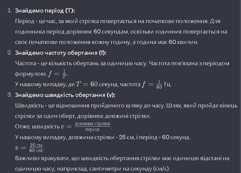 Чому дорівнює період і частота обертання секундної стрілки годинника 25 см? Знайти швидкість обертання стрілки.