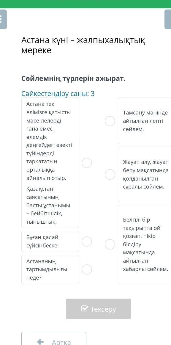 Сәйкестендіру саны: 3 Астана тек елiмiзге қатысты мәсе-лелердi ғана емес, әлемдік деңгейдегі өзекті түйіндерді тарқататын орталыққа айналып отыр. Қазақстан саясатының басты ұстанымы - бейбiтшiлiк, тыныштық. Бұған қалай сүйсінбеске! Астананың тартымдылығы неде? Тамсану мәнінде о айтылған лепті сөйлем. жауап алу, жауап беру мақсатында Қолданылған суралы сөйлем. Белгiлi бiр тақырыпта ой Қозғап, пiкiр бiлдiру максатында айтылған хабарлы сөйлем.