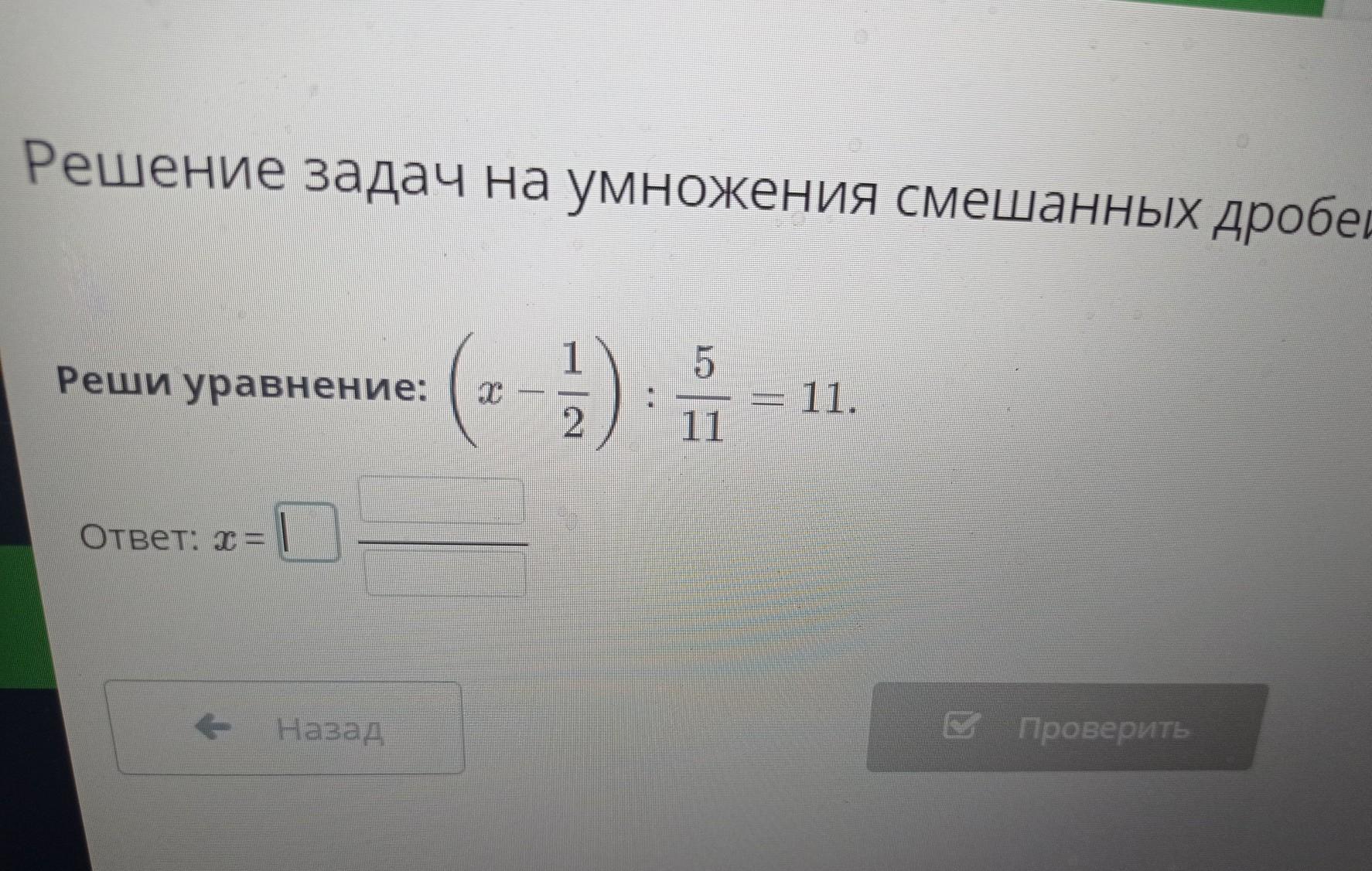 Решение задач на умножения смешанных дробей. Урок 1 Реши уравнение: Ответ: x= + Назад (-1) 2 R 5 11 MAYO 11. 11 Проверить