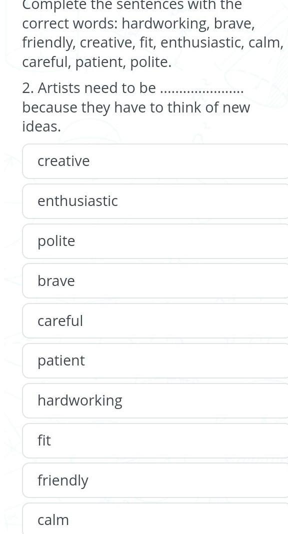 Complete the sentences with the correct words: hardworking, brave, friendly, creative, fit, enthusiastic, calm, careful, patient, polite. 2. Artists need to be because they have to think of new ideas. creative enthusiastic polite brave careful patient hardworking fit friendly calm помоги пожалуйста!!!! СРОЧНО!!!!!!