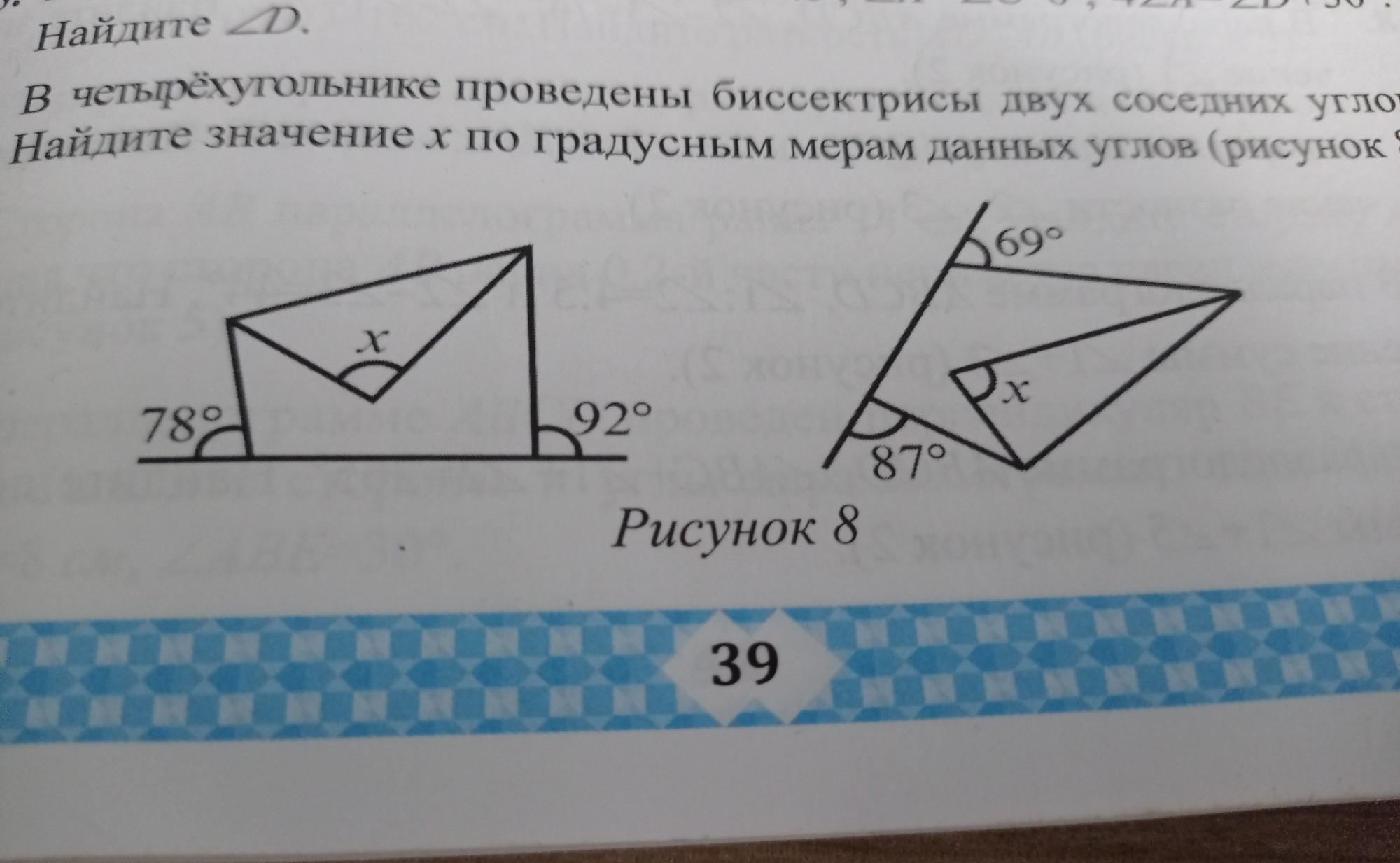 В четырёхугольнике проведены биссектрисы двух соседних углов.Найдите значение x по градусным мерам данных углов