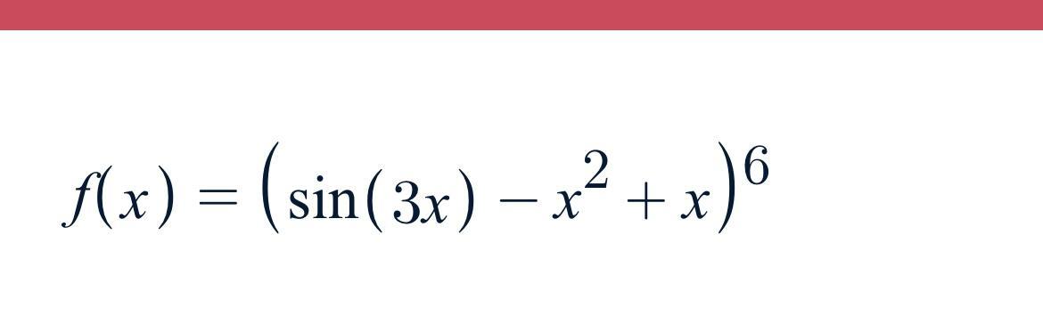 f(x) =  \frac{d}{d \: x} (( \sin(3x) -  {x}^{2}  + x {)}^{6} )