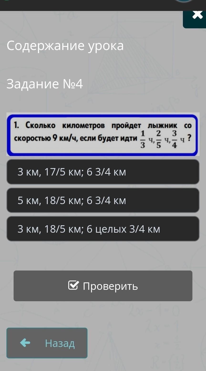 Содержание урока Задание №4 1. Сколько километров пройдет лыжник со скоростью 9 км/ч, если будет идти ? 3 км, 17/5 км; 6 3/4 км 5 км, 18/5 км; 6 3/4 км 12 3 ч, - 3 54 3 км, 18/5 км; 6 целых 3/4 км Проверить ч, - ч