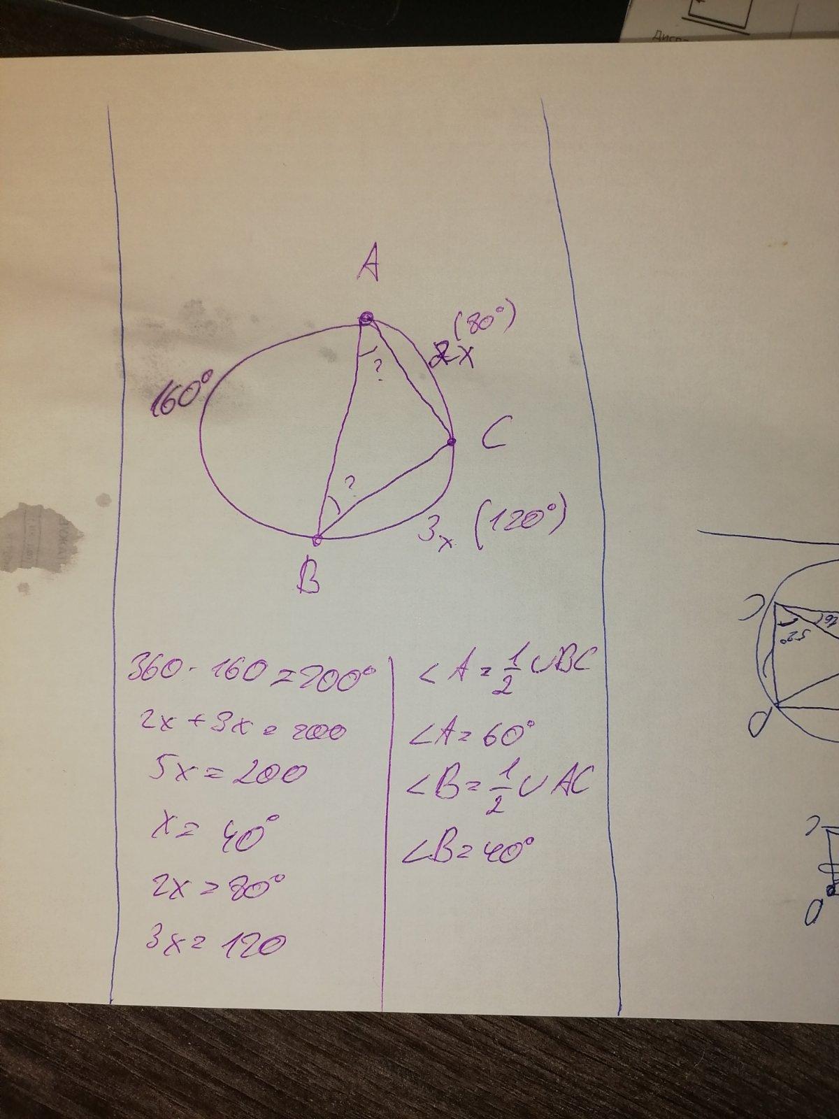 Точки А і В ділять коло на дві дуги, менша з яких дорівнює 160°, а більша точкою С ділиться у відношенні 2:3, починаючи від точки А. Знайти: а) кутABC; 6) кутBAC.