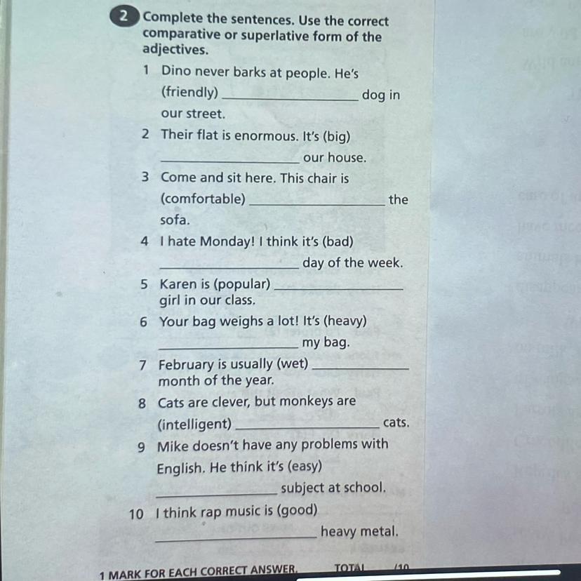 1. the most friendly, 2 bigger than, 3 more comfortable than ,;4 the worst, 5 the most popular, 6 heavier than, 7 the wettest, 8 more intelligent than, 9 the easiest, 10 better than...