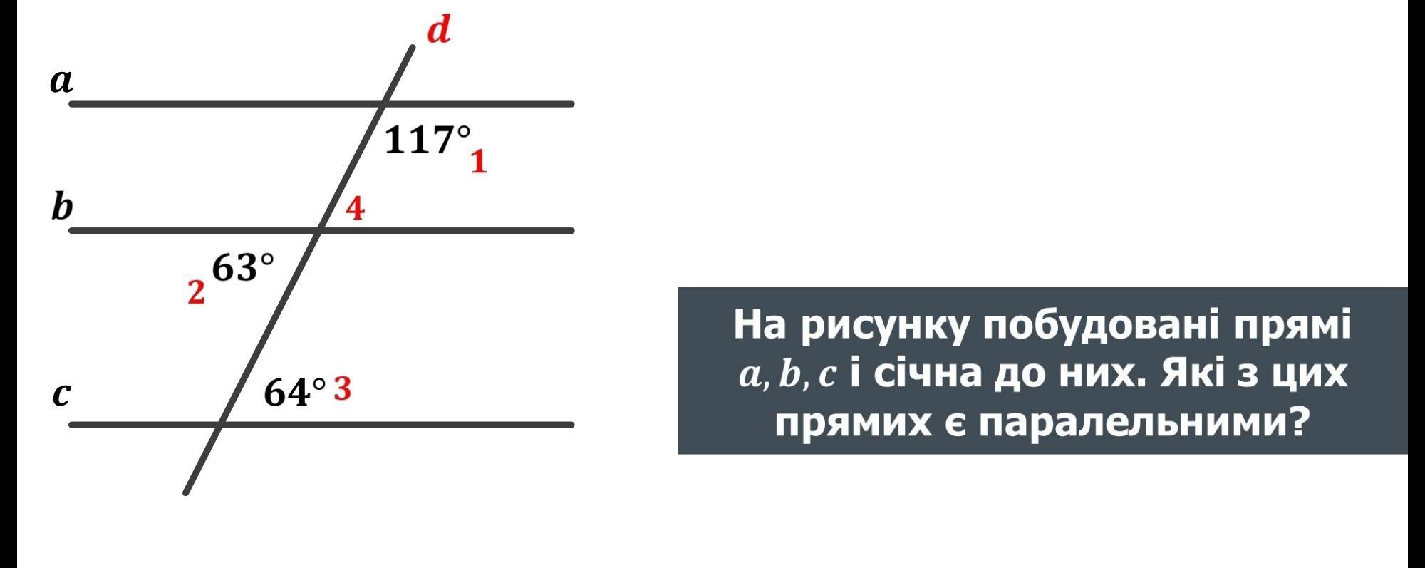 На рисунку побудовані прямі a,b,c і сична до них. Які з цих прямих є паралельними ДАЙТЕ ПЖ ОТВЕТ