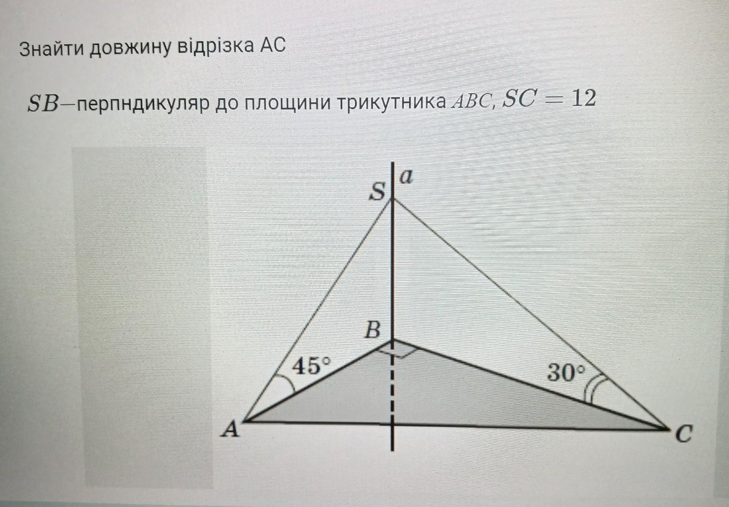 Знайти довжину відрізка АС SB-перпедикуляр до площини трикутника ABC, SC = 12