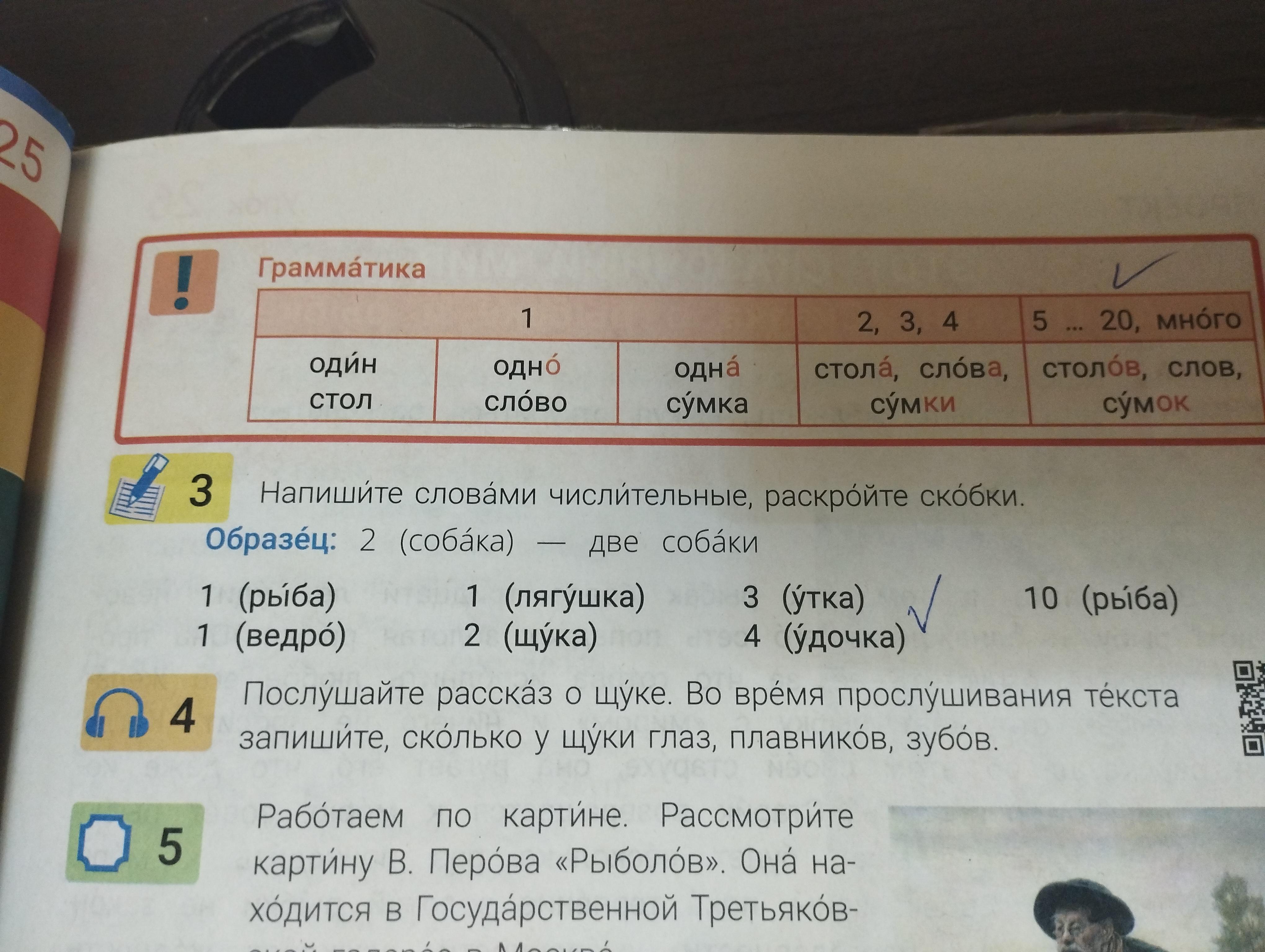 Объяснение:одна рыба,одно ведро,одна лягушка,две щуки,три утки,четыре удочки,десять рыб.