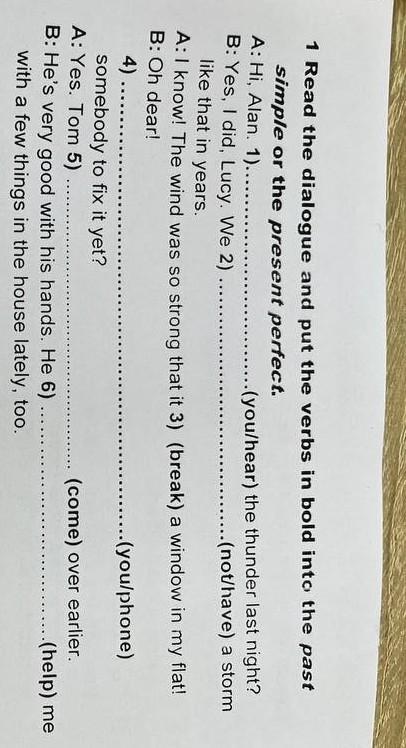 Hi, Lucy. 1) Did you hear the thunder last night? Yes, I did, Lucy. We haven't had a storm like that in years. I know! The wind was so strong that it 3) broke a window in my flat! Oh dear! 4) Have you phoned somebody to fix it yet? A: Yes. Tom 5) came over earlier. B: He's very good with his hands. 6) He has helped me with a few things in the house lately, too.