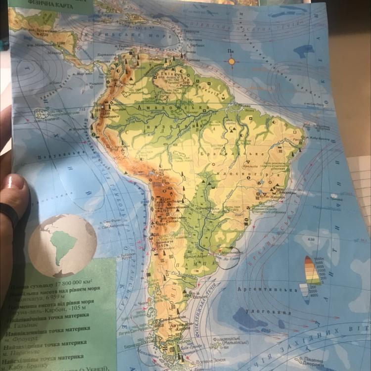 Познач на контурній карті Південної Америки такі географічні обʼєкти:океани Тихий Атлантичний та Південний; протоки Магнлланова Дрейка; острів Вогняна Земля; затока Ла-Плата; Карибське море.