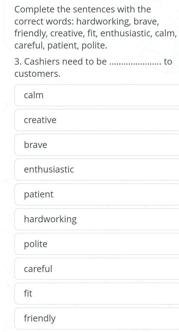 Complete the sentences with the correct words: hardworking, brave, friendly, creative, fit, enthusiastic, calm, careful, patient, polite. 3. Cashiers need to be customers. calm creative brave enthusiastic patient hardworking polite careful fit friendly to
