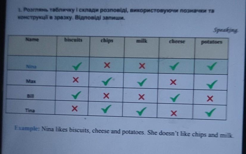 Tina likes chips, milk and potatoes. He doesn't like biscuits and cheese.