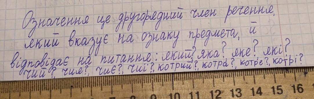 Відповідь: Означення це другорядний член речення, який вказує на ознаку предмета, й відповідає на питання: який?, яка?, яке?, які?, чий?, чия?, чиє?, чиї?, котрий?, котра?, котре?, котрі?