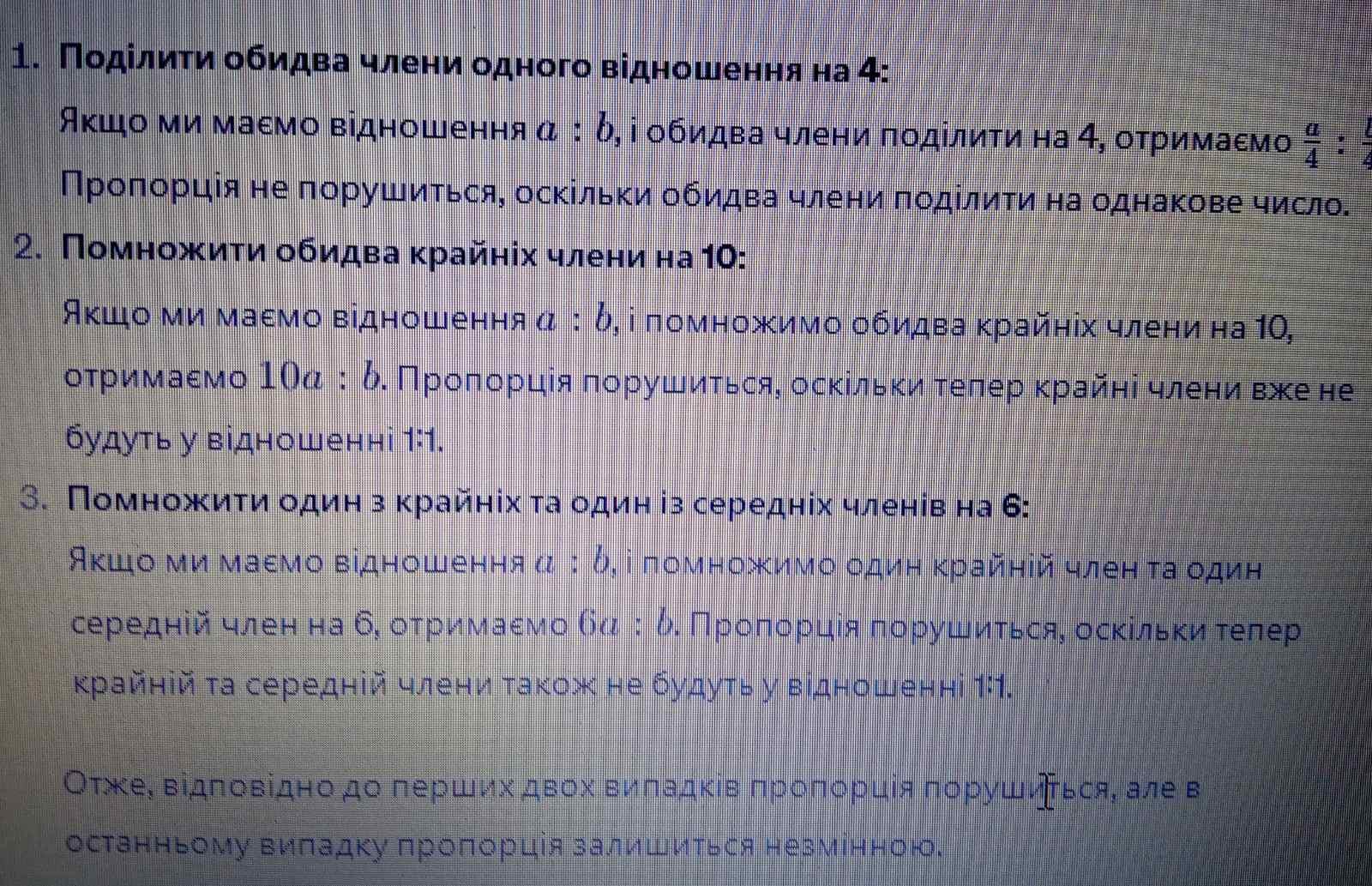Чи порушиться пропорція, якщо: 1) обидва члени одного з відношень поділити на 4; 2) обидва крайніх члени помножити на 10: 3) один з її крайніх членів і один із середніх членів помножити на 6?