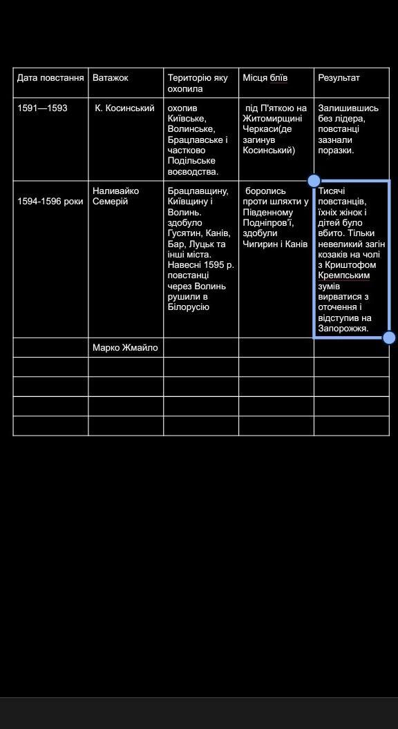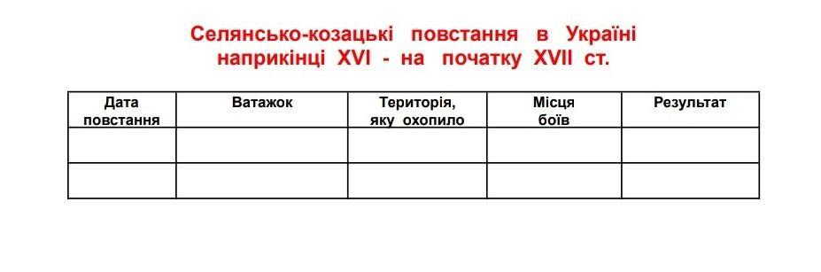 Дата повстання Селянсько-козацькі повстання в Україні наприкінці XVI - на початку XVII ст. Ватажок Територія, яку охопило Місця боїв Результат