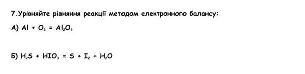 (помогите очень срочно )7.Урiвняйте рiвняння реакцiï методом електронного балансу: А) Al + O2 = Al2O, Б) Н2S + HIO, = S + Iz + H2O