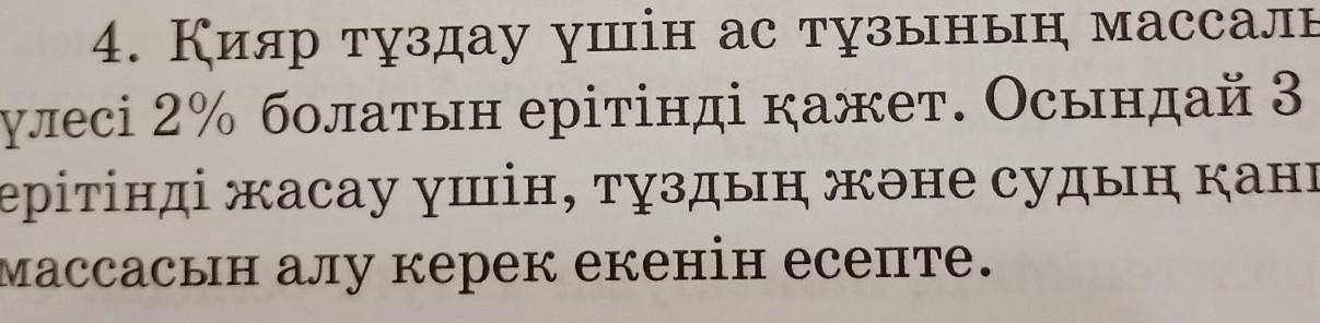 4. Қияр тұздау үшін ас тұзының массалық улесі 2% болатын ерітінді қажет. Осындай 3 кг ерітінді жасау үшін, тұздың және судың қанша массасын алу керек екенін есепте.