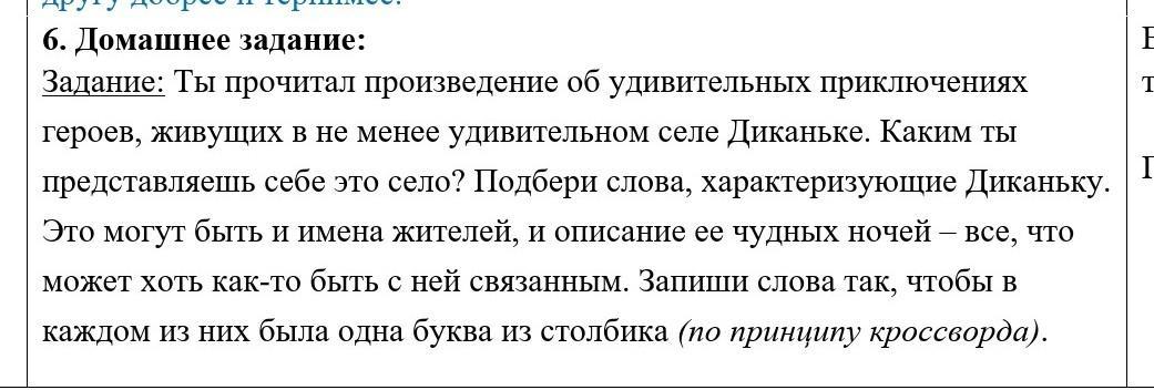 6. Домашнее задание: Задание: Ты прочитал произведение об удивительных приключениях героев, живущих в не менее удивительном селе Диканьке. Каким ты представляешь себе это село? Подбери слова, характеризующие Диканьку Это могут быть и имена жителей, и описание ее чудных ночей – все, что может хоть как-то быть с ней связанным. Запиши слова так, чтобы в каждом из них была одна буква из столбика (по принципу кроссворда).