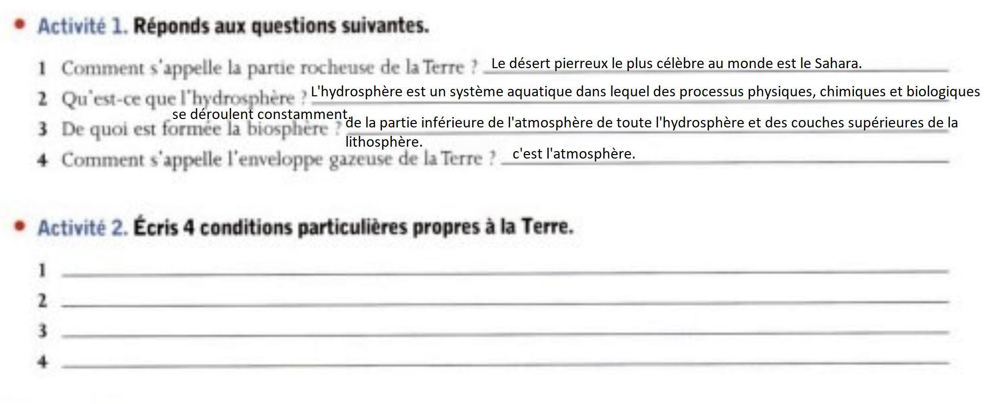 Activité 2. Écris 4 conditions particulières propres à la Terre.