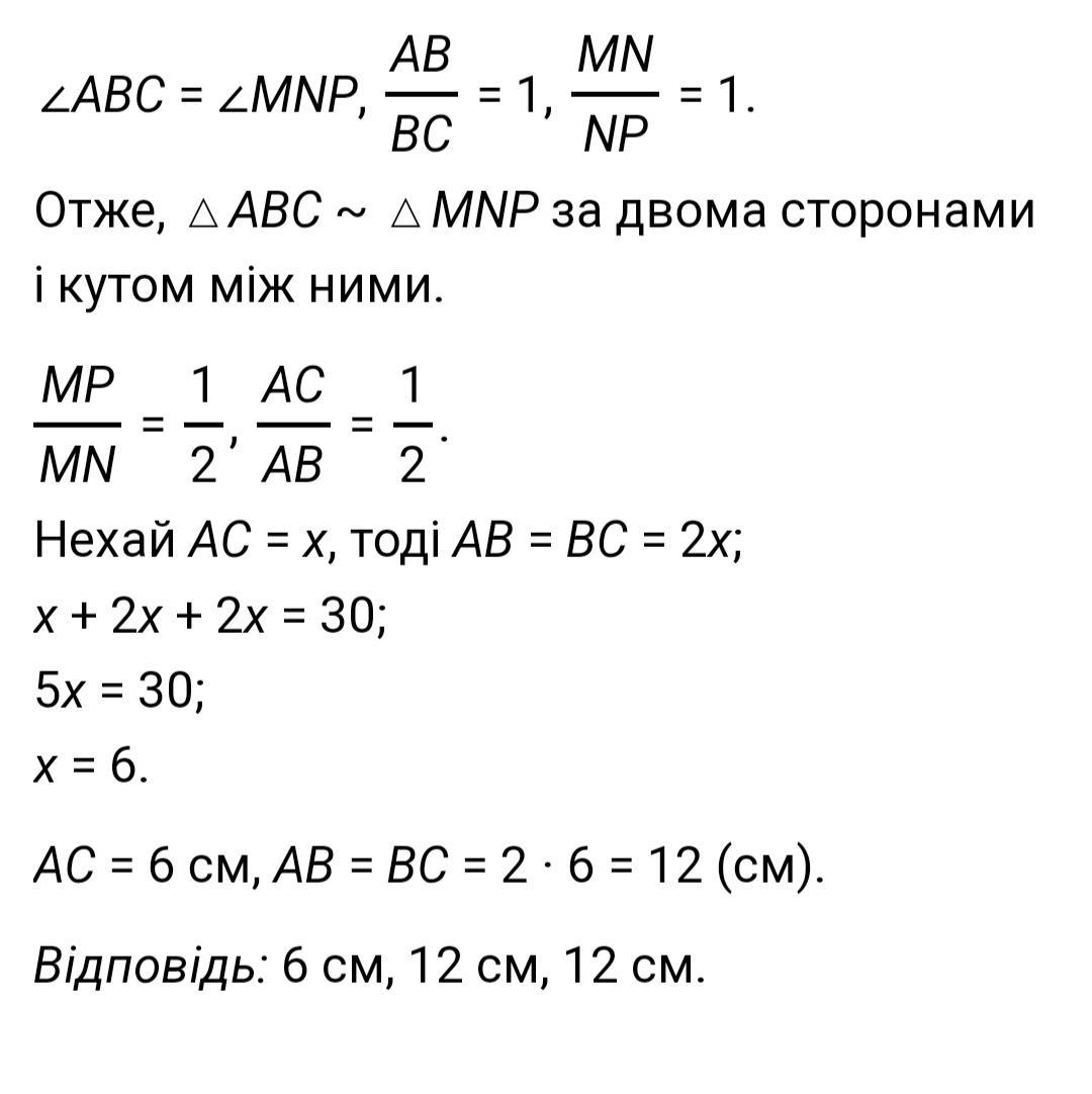 Дано два рівнобедрених трикутники. Кут при верши- ні одного з них дорівнює куту при вершині другого. Пери- метр першого трикутника - 30 см. Знайдіть його сторони, якщо в другого трикутника основа відноситься до бічної сторони як 1 : 2. ДАЮ 85 БАЛОВ НАДО СРОЧНО!!!!!