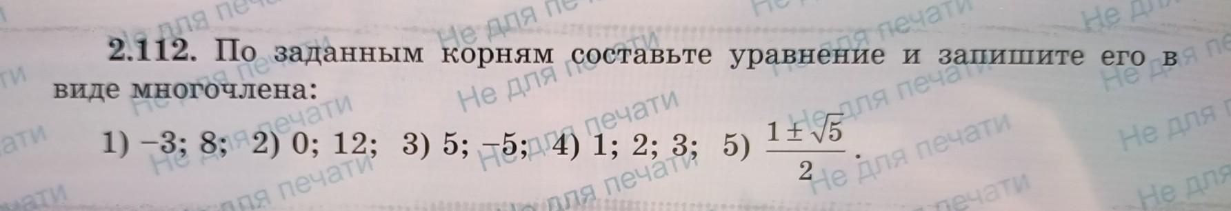 2.112. По заданным корням составьте уравнение и виде многочлена: 1) -3; 8; 2) 0;12 3) 5;-5 4) 1; 2; 3 5) 1±√5/2