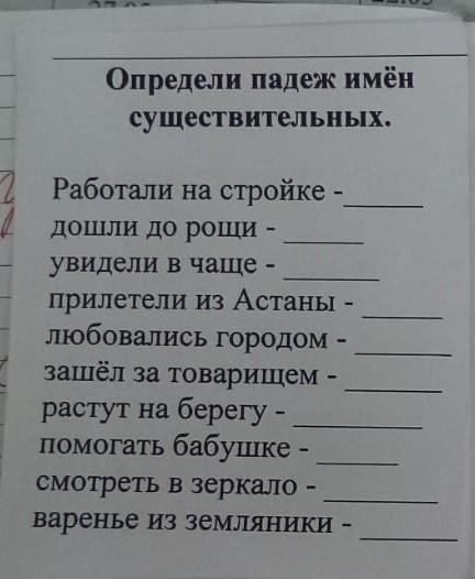 Определи падеж имён существительных. 7 Работали на стройке - дошли до рощи - увидели в чаще - прилетели из Астаны любовались городом - зашёл за товарищем - растут на берегу - помогать бабушке - смотреть в зеркало - варенье из земляники - - -