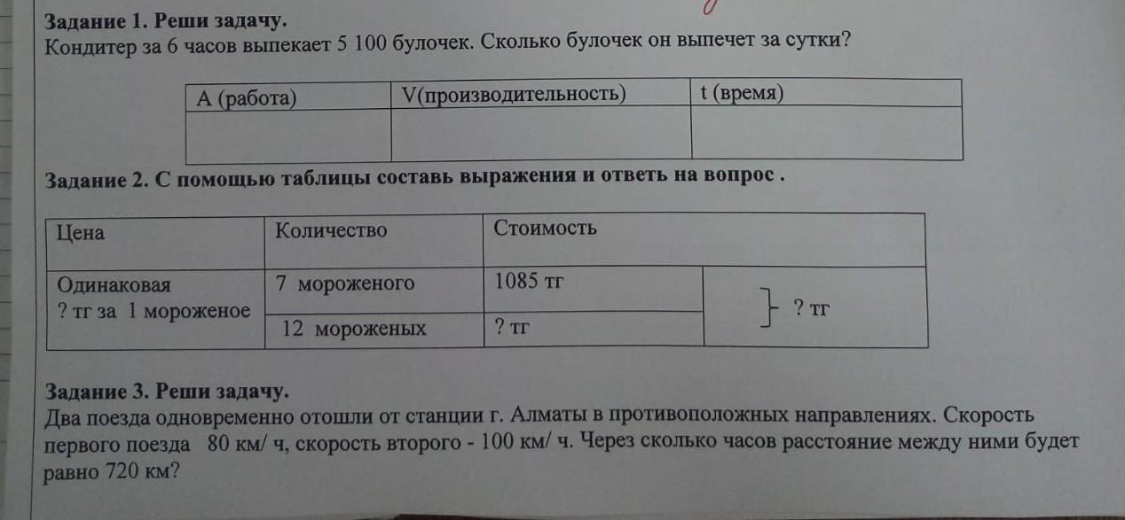 Задание 1. Реши задачу. Кондитер за 6 часов выпекает 5 100 булочек. Сколько булочек он выпечет за сутки? A (работа) V(производительность) t (время) Задание 2. С помощью таблицы составь выражения и ответь на вопрос. Цена Количество Одинаковая ? тг за 1 мороженое 7 мороженого 12 мороженых Стоимость 1085 тг ? тг ? тг Задание 3. Реши задачу. Два поезда одновременно отошли от станции г. Алматы в противоположных направлениях. Скорость первого поезда 80 км/ч, скорость второго - 100 км/ч. Через сколько часов расстояние между ними буде равно 720 км?
