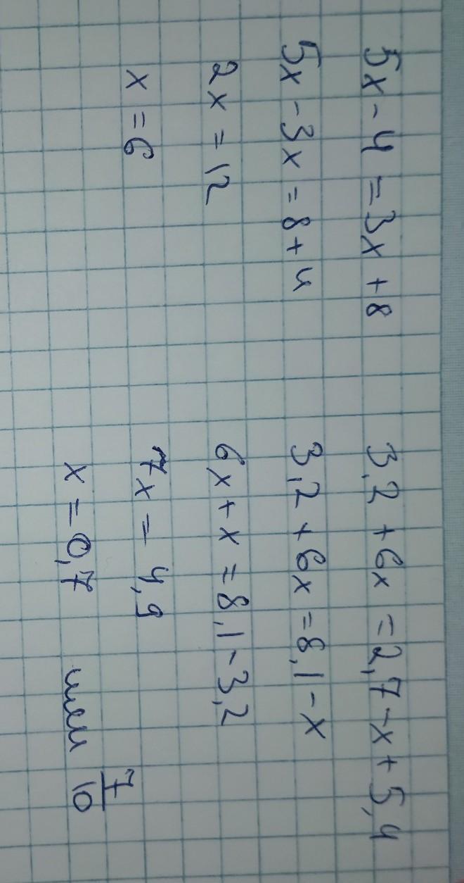 2) 3,2+6х=2,7-х+5,4; переносим числа с иксом в одну сторону, и обычные числа в другую меняя знаки.