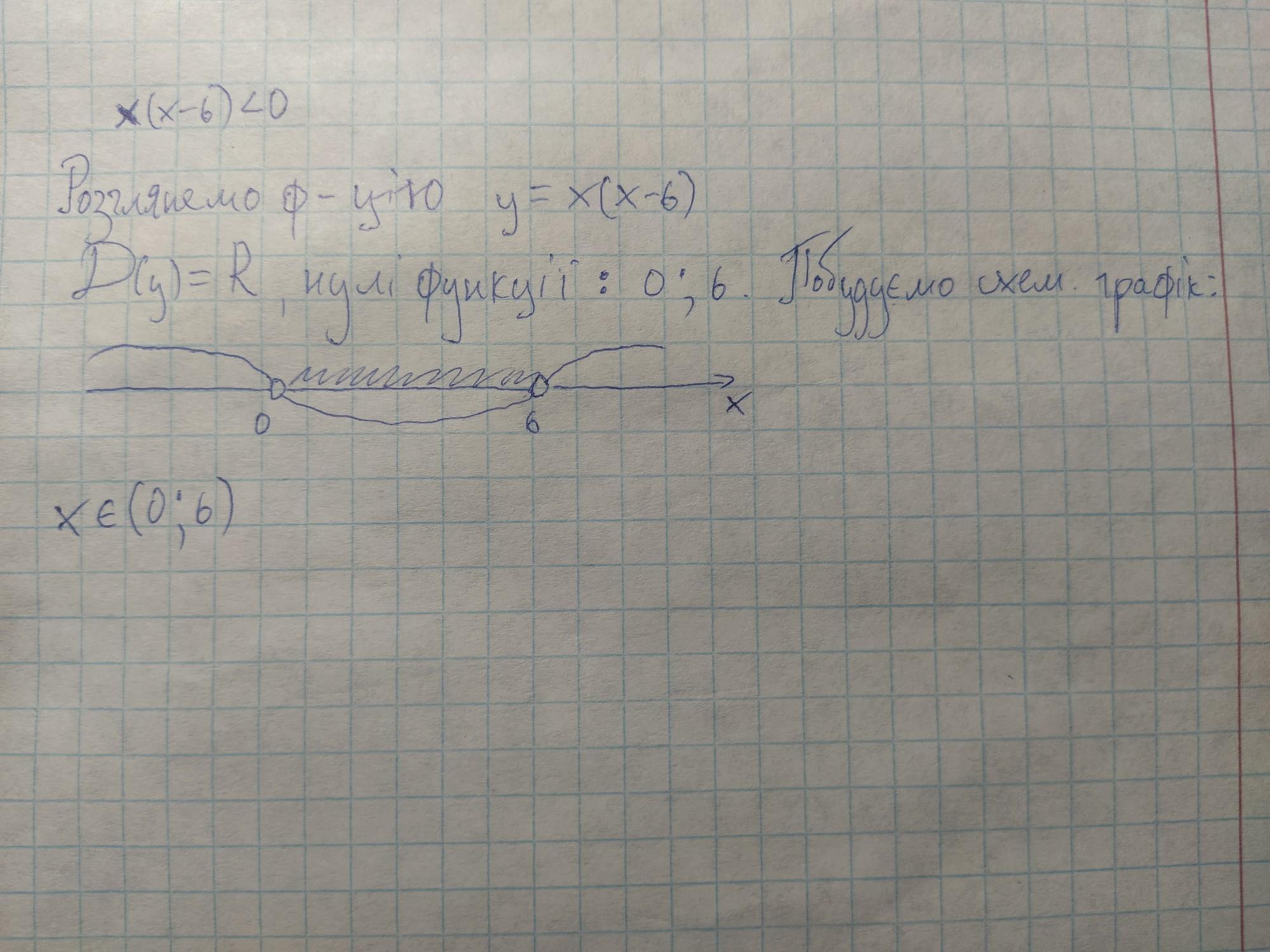 Нерівність розв'язується методом інтервалів. Функція у = х(х - 6) змінює свій знак при проходженні крізь нулі, тому ми можемо сказати її знак на проміжках і визначити потрібний. Точки виколоті, бо точки, де у = 0, нам не потрібні (нерівність строга)