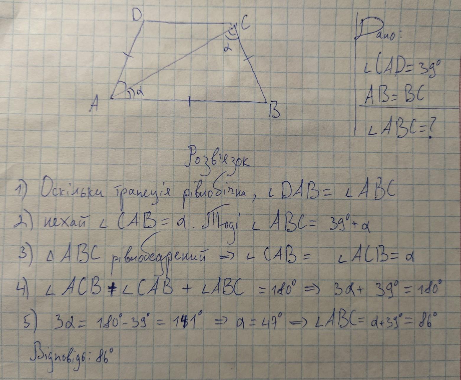 У рівнобічній трапеції ABCD AB- більша основа, AB = BC , Кут CAD=39°