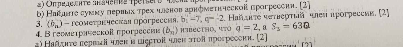 3. (bn) - геометрическая прогрессия. bi =7, q= -2. Найдите четвертый член прогрессии. [2]